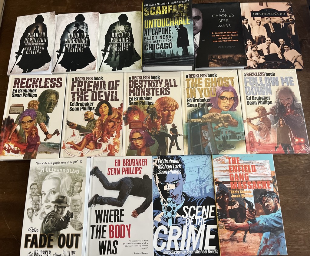 So without further ado, I present to you my reading list for 2025 (so far). I’ve included fiction novels from the master himself, Max Allan Collins, along with engrossing and meticulously researched non-fiction by Collins, A. Brad Schwartz, and John J. Binder. There’s a healthy dose of graphic novels penned and illustrated by my favorite duo, Ed Brubaker and Sean Phillips. And in honor of the old man, there’s even a Western thrown in. Since a picture is worth a thousand words, I present to you my 2025 reading haul: